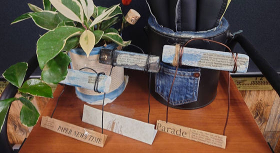 合皮で作ったリボンに端材のデニム生地や